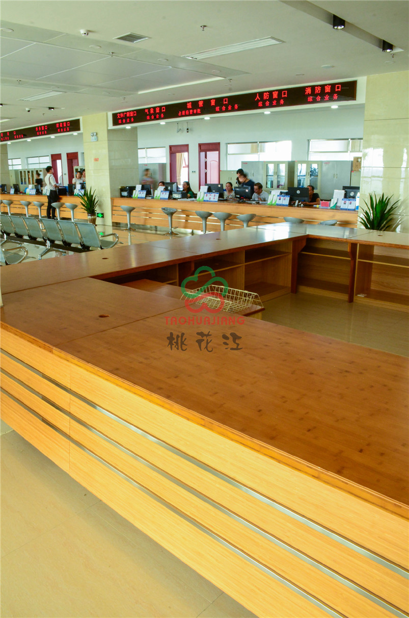 桃江縣政務服務中心是桃江縣委、縣政府為了優化投資環境、提高辦事效率、更好地為廣大群眾和投資者服務而設立的正科級事業機構。政務中心大廳內的辦公桌全部使用桃花江竹材科技的普竹材料打造,色澤鮮明,質地環保,整體感覺簡約清新。竹材清正廉潔的高品質正好與政務中心的宗旨:陽光行政、勤廉公平、服務至上、便民利民相互呼應。