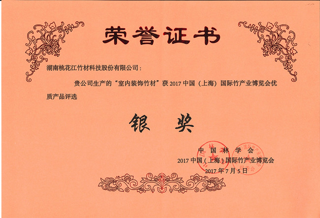 2017年7月,在中國(上海)國際竹產業博覽會產品評選中湖南桃花江竹材科技的室內裝飾竹材榮獲銀獎。該榮譽是對桃花江竹材科技的高度認可,桃花江生產的室內裝飾竹材取之天然,綠色環保,古樸自然,是有文化底蘊的室內裝修裝飾材料,是木材的理想替代品。