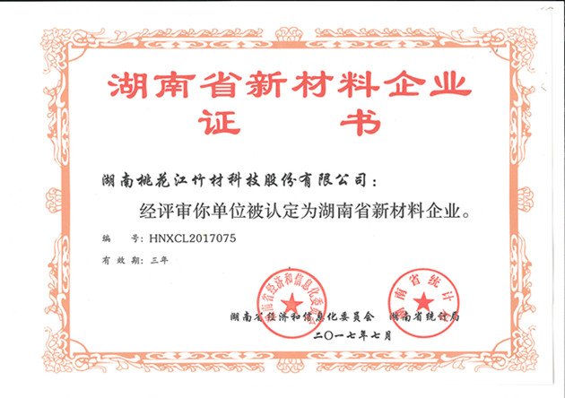 2017年7月,湖(hu)南省經濟和(he)信息化委員會(hui)、湖(hu)南省統(tong)計局為(wei)湖(hu)南桃花江(jiang)竹(zhu)材(cai)(cai)科技(ji)(ji)股份有限公司正(zheng)式頒發(fa)(fa)“湖(hu)南省新(xin)材(cai)(cai)料企業”證(zheng)書(證(zheng)書編號(hao):HNXCL2017075)。湖(hu)南省新(xin)材(cai)(cai)料企業的認(ren)定,標志(zhi)著湖(hu)南桃花江(jiang)竹(zhu)材(cai)(cai)科技(ji)(ji)在新(xin)型竹(zhu)材(cai)(cai)領域的成績得到國家認(ren)可(ke)與支持(chi),是一(yi)項(xiang)具有含金量的突(tu)破性(xing)榮(rong)譽。作為(wei)中國竹(zhu)業龍頭企業,湖(hu)南桃花江(jiang)竹(zhu)材(cai)(cai)科技(ji)(ji)一(yi)直走在新(xin)型竹(zhu)材(cai)(cai)研發(fa)(fa)、運用和(he)推廣的前沿,為(wei)全球竹(zhu)產業的發(fa)(fa)展持(chi)續貢獻力量。