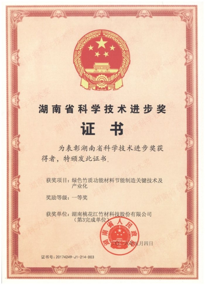 其中, 湖南桃花江竹材科技股份有限公司的綠色竹質功能材料節能制造關鍵技術及產業化項目榮獲2017年湖南省科學技術進步一等獎。