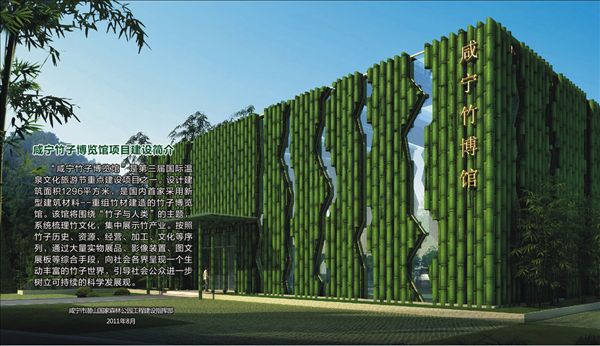 該竹子博物館外形借鑒水立方模式,占地面積近700平方米,建筑面積1362平方米,分兩層,高13米。博物館全部采用新型重組竹材——竹楠木建造,外立面也采用竹楠木制作的仿楠竹裝飾。